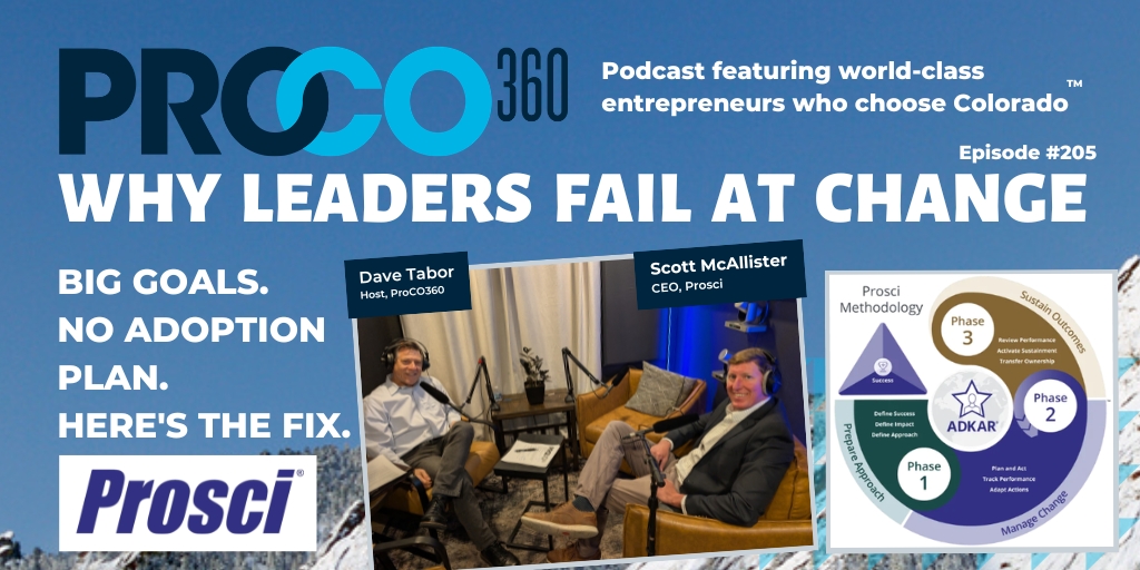 This is the ProCO360 podcast for people who love Colorado and love hearing from Colorado’s great entrepreneurs, entrepreneurs who have something special going on, something that drives my curiosity. I’m Dave Tabor, host of ProCO360 I’m a former tech entrepreneur, and I love having these conversations and sharing them with you. This will be a fun episode. Most leaders think change fails because the strategy was wrong. But what if it’s not that at all? What if the real reason is people today’s guest leads Prosci, a Colorado based company that’s built a global reputation around one deceptively simple idea, change only works if people actually buy in. So how do you make change feel natural instead of forced? And why do even the smartest organizations get this wrong? Let’s find out. Scott McAllister, CEO of proci, welcome to Proko. 360 Thanks, Dave. It’s great to be here. Thanks for having me. Yeah. Well, you’re welcome. And so why do even smart companies screw up change? Well, if you look at